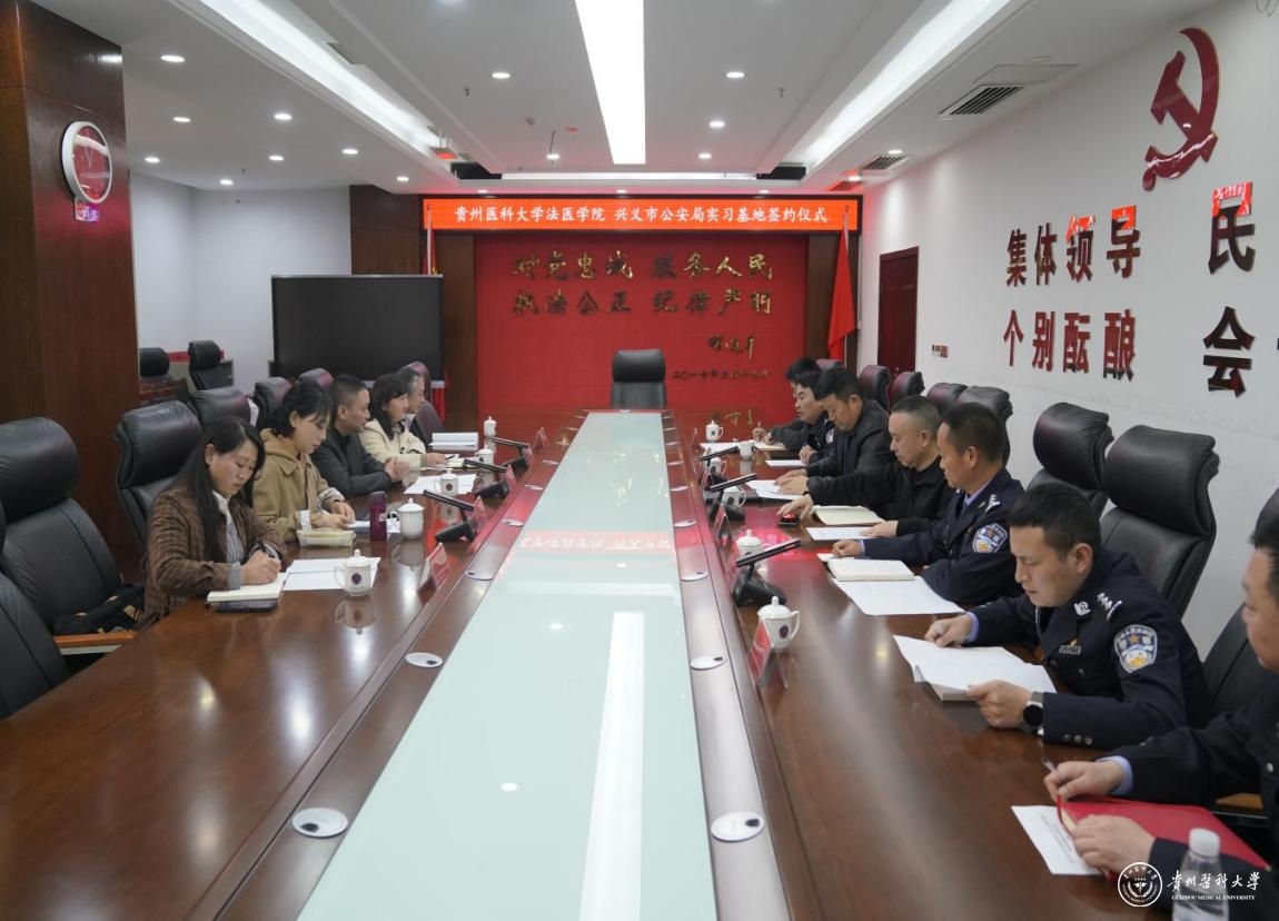 在兴义市公安局,双方召开专题座谈会,黔西南州公安局分管领导、黔西南州公安局刑侦支队负责人,兴义市公安局领导以及在兴义市公安局工作、实习的同学参加座谈会,兴义市公安局副局长李黄河主持。双方分别介绍了法医工作开展、人才培养及专业建设情况,公安部门就课程设置、实践教学提出建议,双方同意建立常态化沟通机制,实现优势互补。座谈会后,法医学院与兴义市公安局签订法医学实践教学基地协议,为学生提供稳定实践平台,为公安系统输送后备人才。