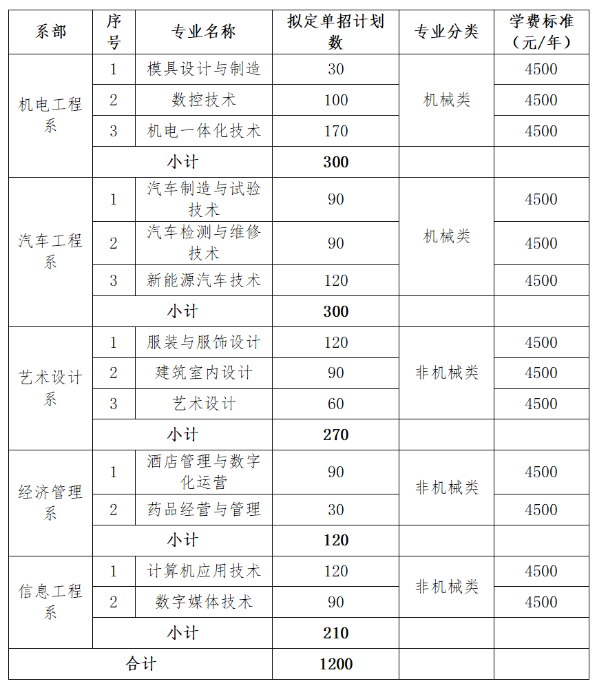 学校2026年单招总计划数为1200人,其中包含单列计划的10人。下表招生专业等信息仅供参考,单招专业及招生计划以省教育考试院网上填报志愿系统数据为准。各专业最终学费标准以2026年湖南省物价主管部门审核为准。所有专业均不限考生类别,即物理类、历史类、职高对口类考生均可报考。
