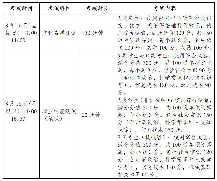 我校单招考试按照“文化素质+职业技能”方式,分类组织考试。根据考生的类别,考试按以下方式进行: