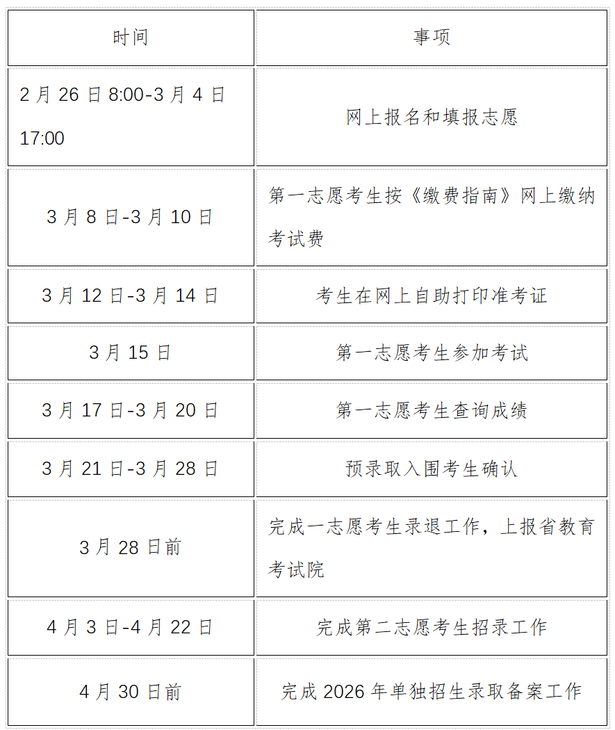 备注:若第一志愿生源不足,未完成单招计划,我校将组织第二志愿考试,参考对象为第二志愿报考我校且未被第一志愿学校录取考生,时间为2026年4月11日。各科目的具体考试时间及地点将在我校官网上另行公布。