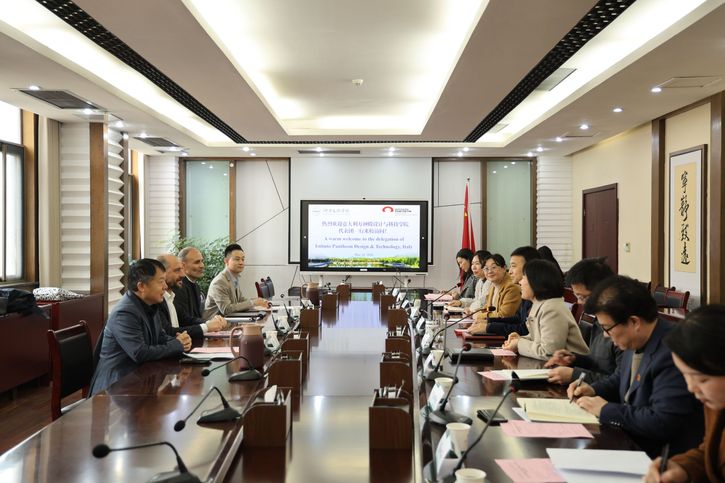 会前,意大利万神殿设计与科技学院代表团一行实地走访学校美术学院,参观了学生设计作品展,并与学院师生亲切交流。