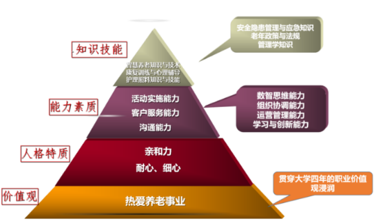 突出对学生综合素质的培养,注重培养学生跨学科的知识和思维能力。注重培养学生的实践能力。学生将掌握管理学、社会学、护理学等学科核心知识,为成为一名综合性复合型养老服务管理人才打下基础。