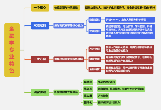 金融学专业的核心特色可概括为 “一个核心、双维赋能、三大方向、四轮驱动” 的培养体系。