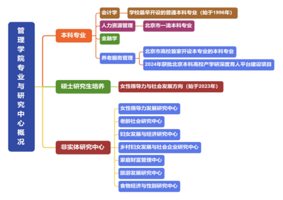 现开设会计学、人力资源管理、金融学和养老服务管理4个专业。其中会计学是学校最早开始招生普通本科的专业(1996年),人力资源管理专业为北京市一流本科专业建设点,养老服务管理是北京市高校首家开设的本科专业。2023年管理学院联合社会工作学院招生社会工作专业女性领导力与社会发展方向专业硕士。7个非实体研究中心挂靠在管理学院:女性领导力发展研究中心、老龄社会研究中心、妇女发展与经济研究中心、乡村妇女发展与社会企业研究中心、家庭财富管理中心、旅游发展研究中心、食物经济与性别研究中心。