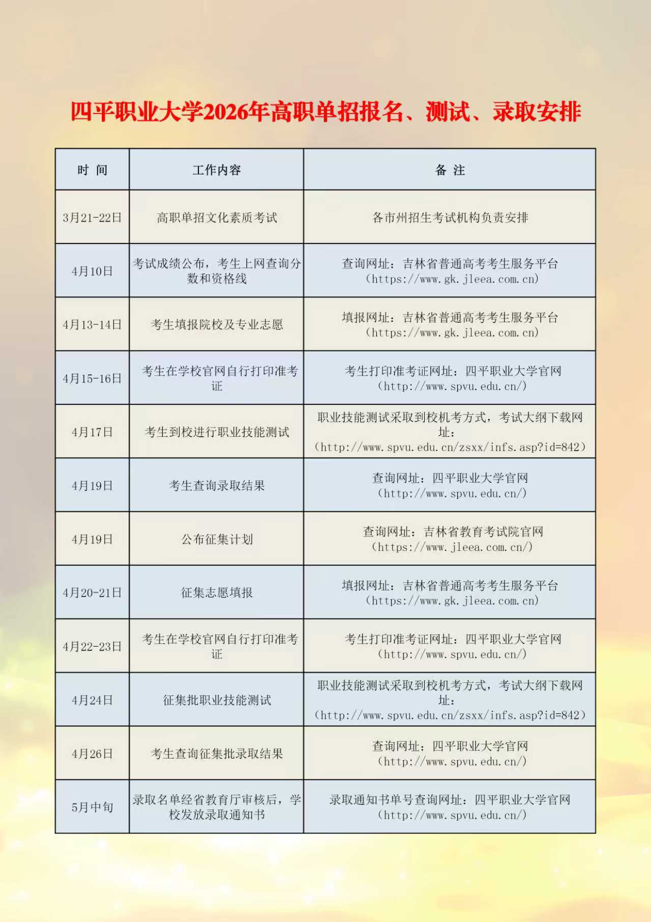 2026年四平职业大学高职单招报名、测试、录取安排