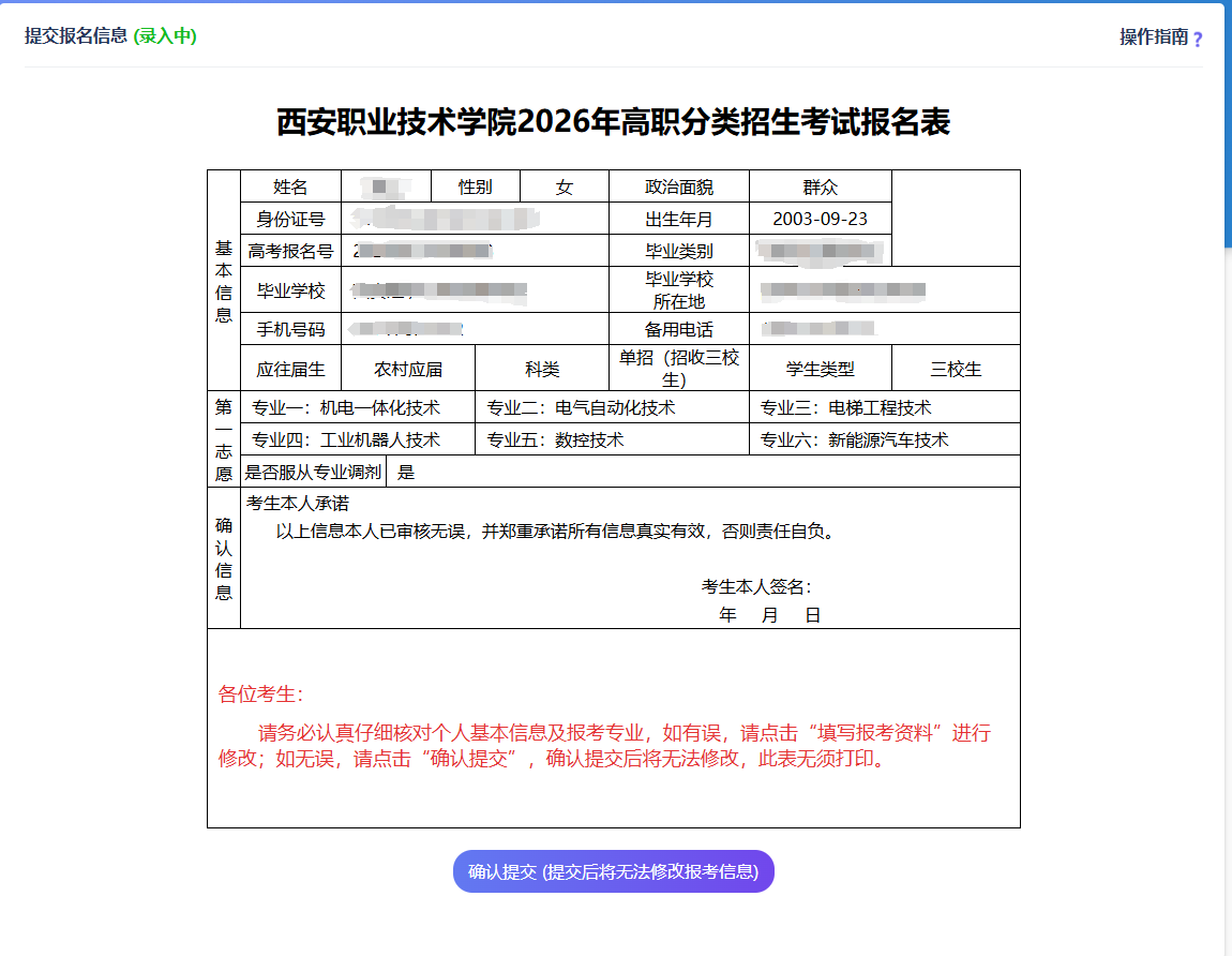 核对个人基本信息和专业志愿信息,核对无误后,点击“确认提交”,提交考生报考信息,专业志愿填报完成。点击“确认提交”前,可修改已填报的内容,点击“确认提交”后即无法修改。