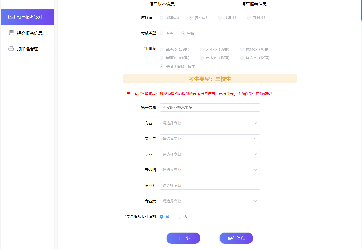我校设置6个专业志愿及“是否服从专业调剂”表态栏供考生选择,第一专业志愿为必选项,其他专业志愿为可选项,“是否服从专业调剂”表态栏默认为“是”,若不服从专业调剂,请选择“否”,核对无误后,点击“保存信息”完成保存。