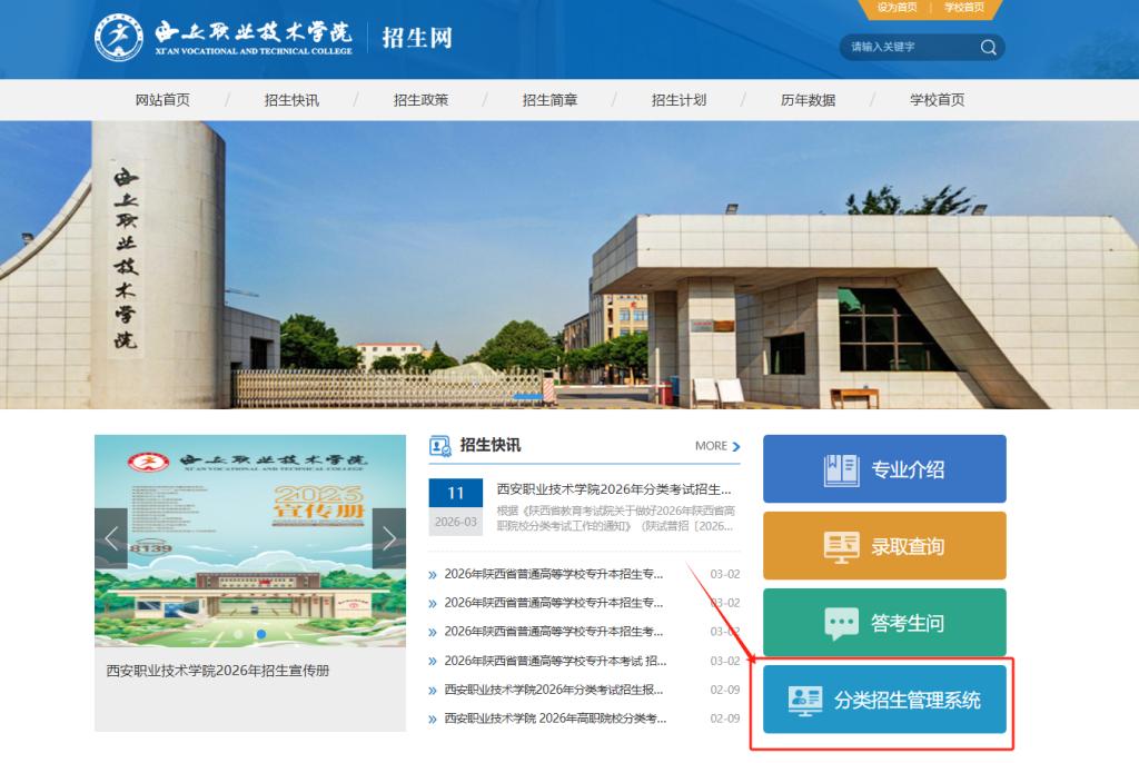 考生登录西安职业技术学院招生网(网址:https://zs.xzyedu.com.cn/),点击“分类考试招生管理系统”,进入分类考试报名系统。账号为学生身份证号,初始密码为xs+身份证号后六位。