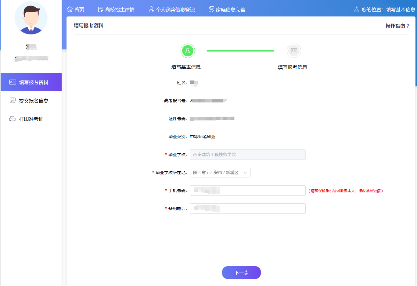 第一步 点击“填写报考资料”菜单,完善个人基本信息,输入完成后,点击“下一步”。