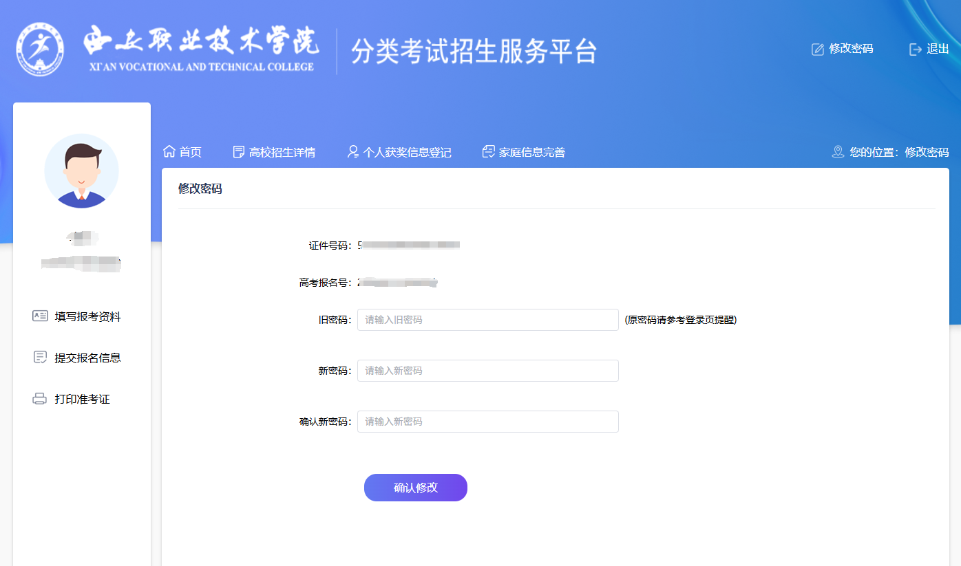 考生登录系统后,系统强制修改初始密码,考生输入初始密码及新密码后,点击“确认修改”完成初始密码修改。请务必牢记修改后的新密码,后续登录系统均用修改后的新密码登录。
