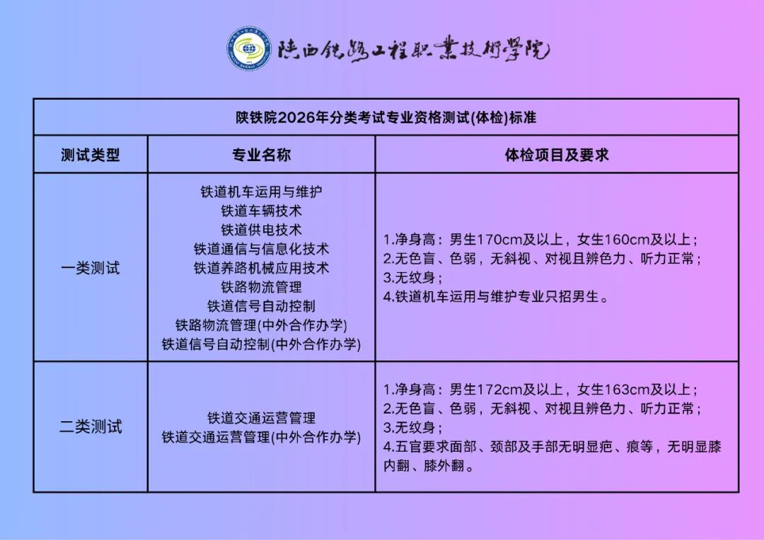 1.专业资格测试(体检)项目及要求根据用人单位招聘标准进行设置,请各位考生根据自身情况慎重选择。所报考专业中无以上体检专业者,无需来校体检。
