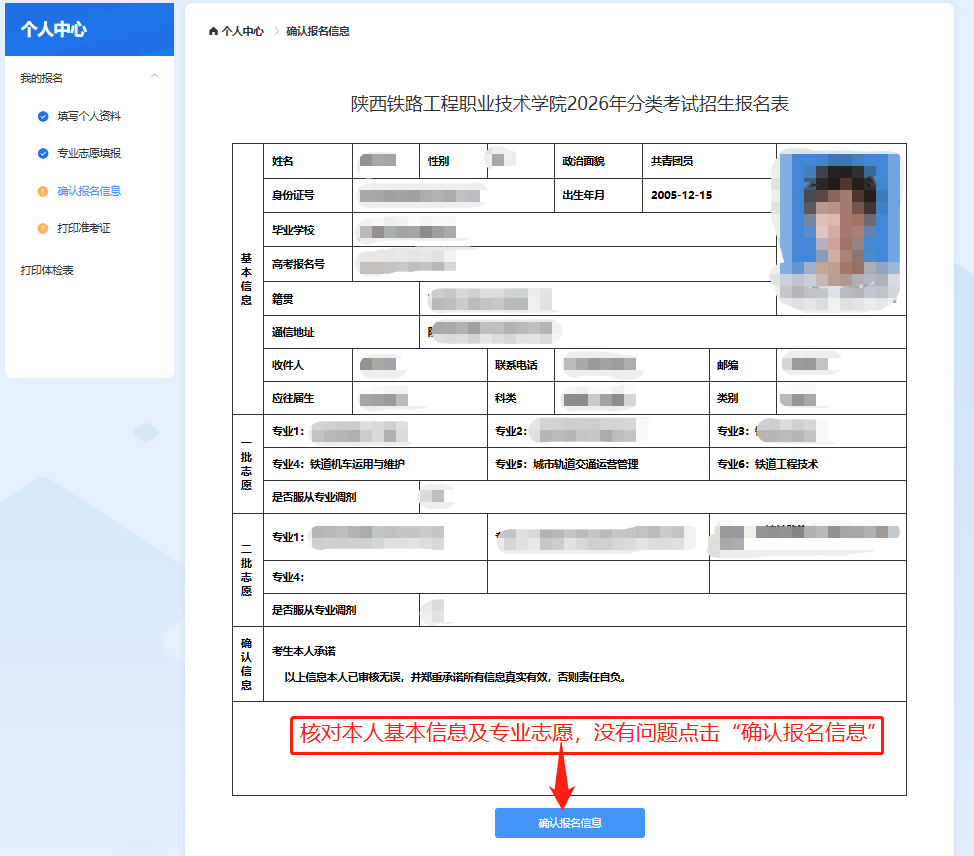 确认本人信息及专业填报无误,点击确认报名信息。若有问题返回修改。
