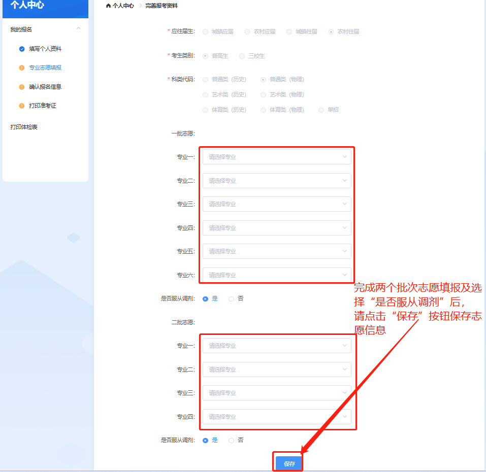 专业报考分为两个批次:第一批次为普通专业(最多可选择6个),第二批次为中外合作办学专业(最多可以选择4个),学校录取时依据分数,优先满足考生的第一批次志愿,当第一批次志愿未被录取时,再进行第二批次志愿录取;若考生意向是就读第二批次中外合作办学专业,则考生志愿填报时仅填写第二批次志愿,一批志愿选择“不报考本批次专业”。选择完专业后点击“保存”。