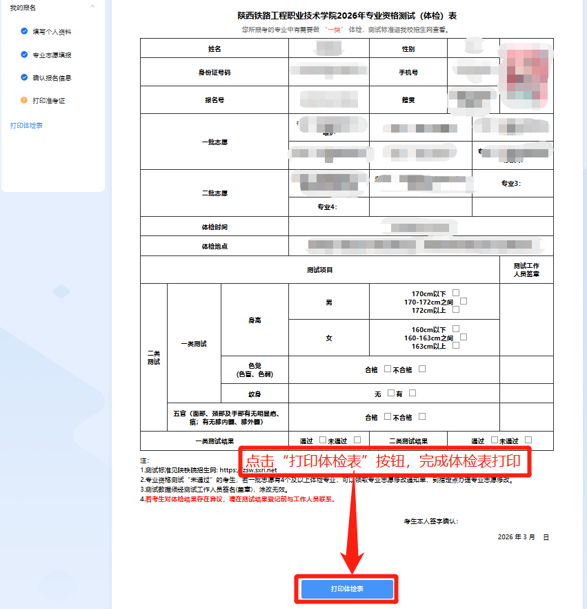 报考我校有资格测试体检要求的专业,点击左侧“打印体检表”菜单,再点击下方 “打印体检表”按钮完成打印。