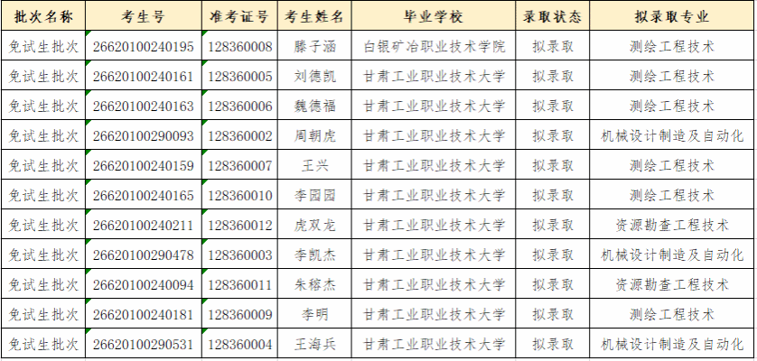 根据《关于印发《2026年甘肃省普通高校高职(专科)升本科免试招生工作实施方案》的通知》(甘招委发〔2026〕1号)的文件精神,现将我校免试生招生考试(第一轮)拟录取名单予以公示(详细名单见下表),公示期为2026年3月15日至3月17日。
