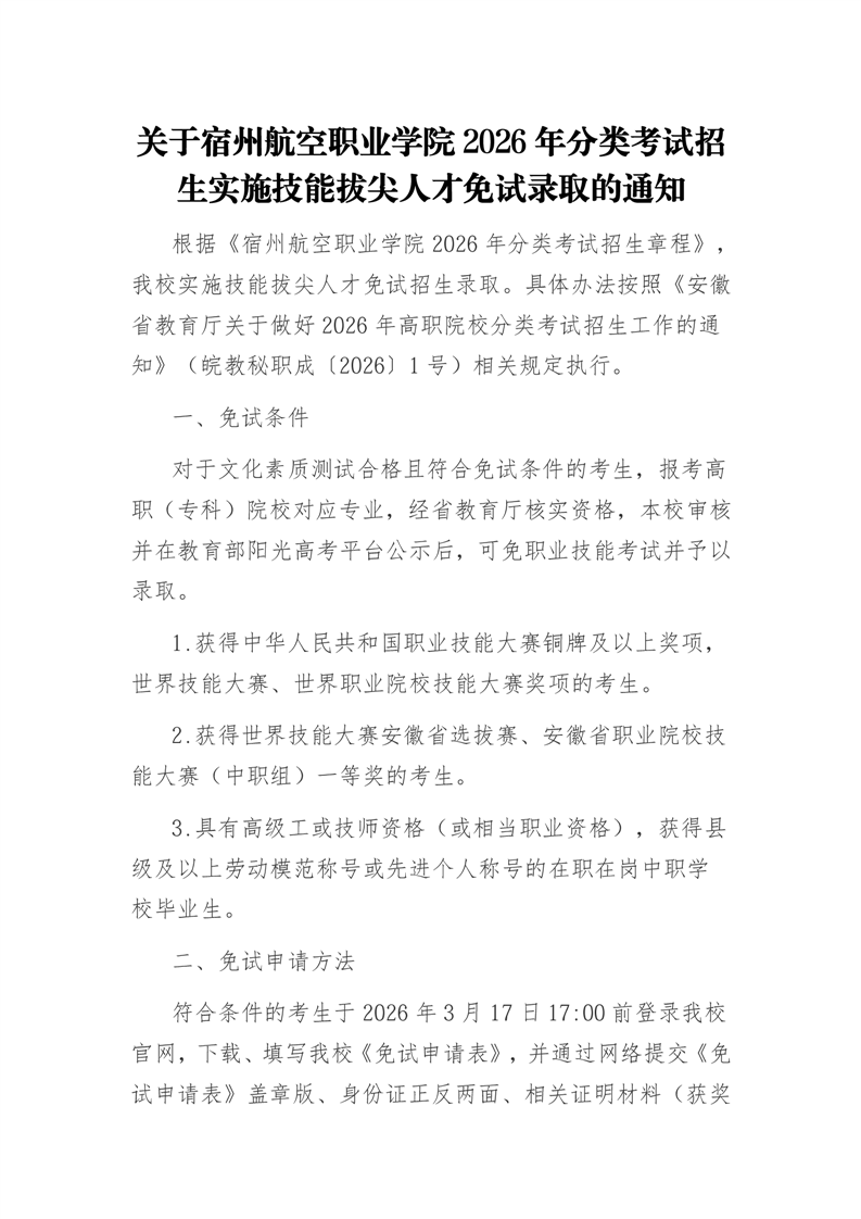 宿州航空职业学院2026年分类考试招生免试生申请表.doc