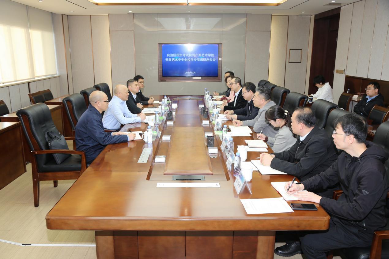 3月13日上午,自治区招生考试院党委书记、院长,自治区教育厅党组成员刘冰率队到我校调研2026年艺术类专业校考工作,并在漓江画派艺术中心1601会议室与我校召开座谈会。学校领导刘伯贤、韦俊平、谢仁敏,以及自治区纪委监委驻广西艺术学院纪检监察组、学校党委党风廉政建设办公室/党委巡察工作办公室、招生办公室等部门有关负责人参加座谈。