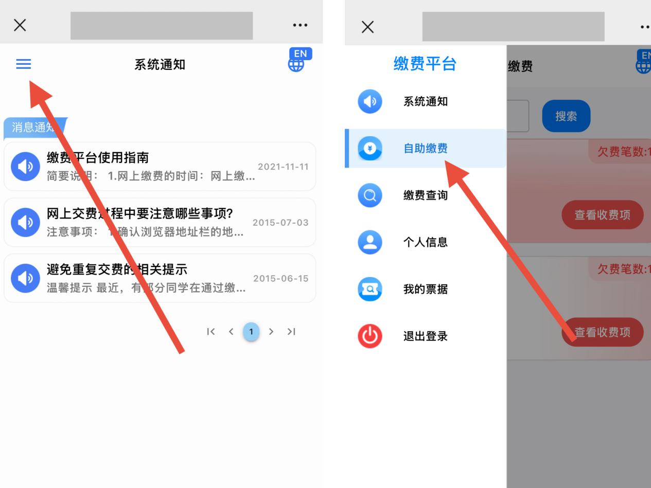 3、缴费:点击左上角的三条横线,选择自助缴费,会出现需要缴费的项目,点击对应的收费项去支付(可以选择全部缴费,也可以选择某一收费项进行缴费)、点击去支付,选择支付方式支付,提交支付支付完成即可。点击缴费查询可以查询到已经缴款成功的收费项。