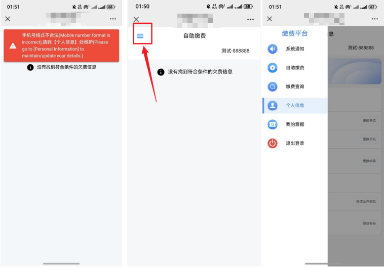2、如果登录出现如下界面,等待提示消失,点击左上角的三个横线,进入个人信息修改成正确格式的手机号。