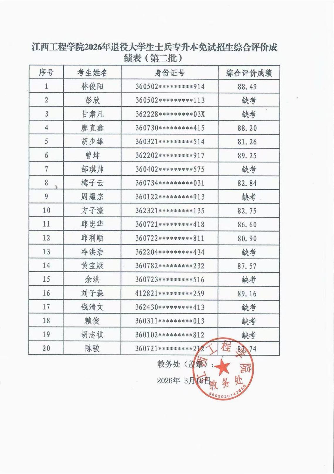 江西工程学院2026年退役大学生士兵专升本免试招生综合评价成绩表(第二批)
