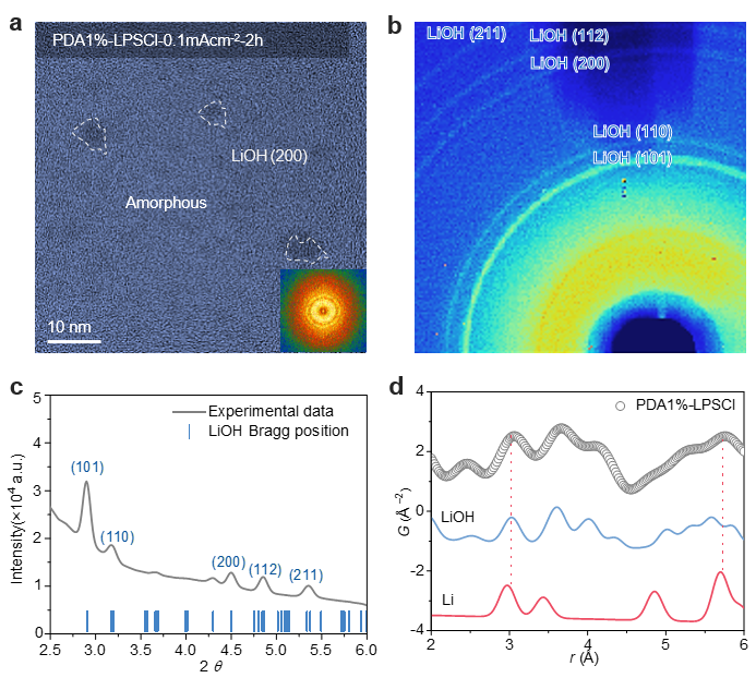 在PDA-LPSCl电解质层中,锂沉积的相组成与微观形貌表现出明显差异。如图1a所示,在同样0.1mA cm⁻²电流密度下沉积2h后,TEM图像显示沉积层以非晶态为主,并伴随少量LiOH纳米晶均匀分布;相应FFT图案中未见明显长程有序的衍射信号。随着充电时间延长至100h,同步辐射二维衍射图像(图1b)仍未观察到金属锂的特征条纹,而仅出现LiOH的弥散环,进一步佐证了沉积物长期处于无序或低有序态。同步辐射XRD(图3.8c)与PDF分析(图3.8d)结果表明,沉积物主要由LiOH构成,在约3.1Å与5.7Å处出现的短程有序峰可归因于非晶/纳米晶锂与含氧物种之间的局域配位。综上所示,PDA的引入不仅改变了锂沉积物的相组成,而且显著稳定了非晶态/纳米结构特征,能够有效缓解局部电流集中和枝晶化行为,从而提升沉积层的可控性与循环稳定性。