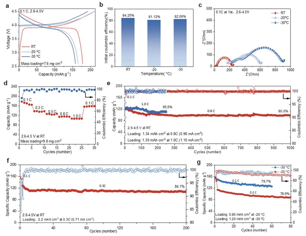 (a)不同温度下的充放电曲线(-30℃、-20℃、室温),所有电池的截止电压为2.6–4.5V(1C=140mAh g⁻¹);