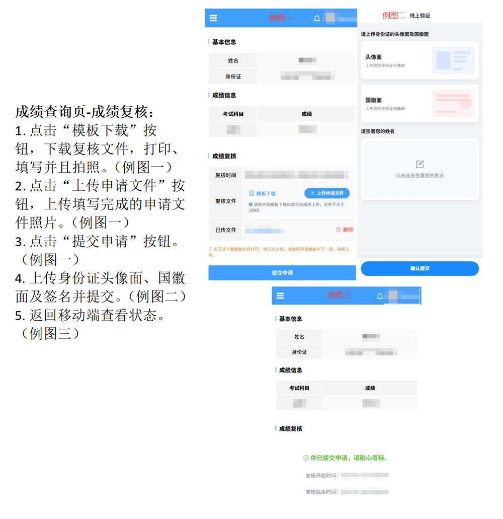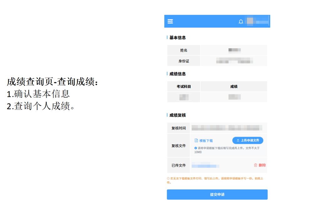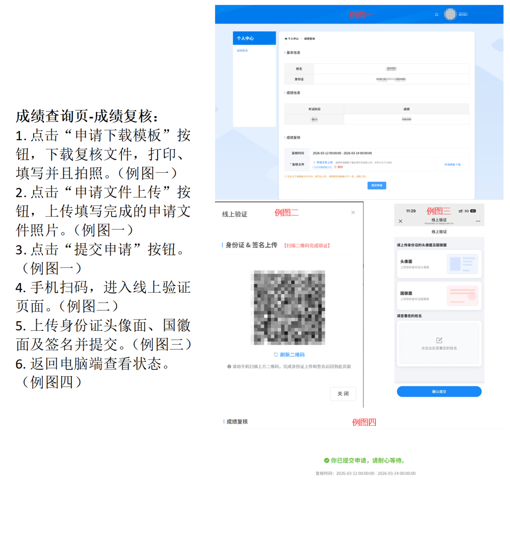 考生填写《湘中幼儿师范高等专科学校单招成绩复核申请表》(附件),并携带申请表、身份证复印件、准考证复印件等送到学校招生就业指导处229办公室,学校招生就业指导处将在收到申请后1个工作日内完成复核工作,并将复核结果通知考生。