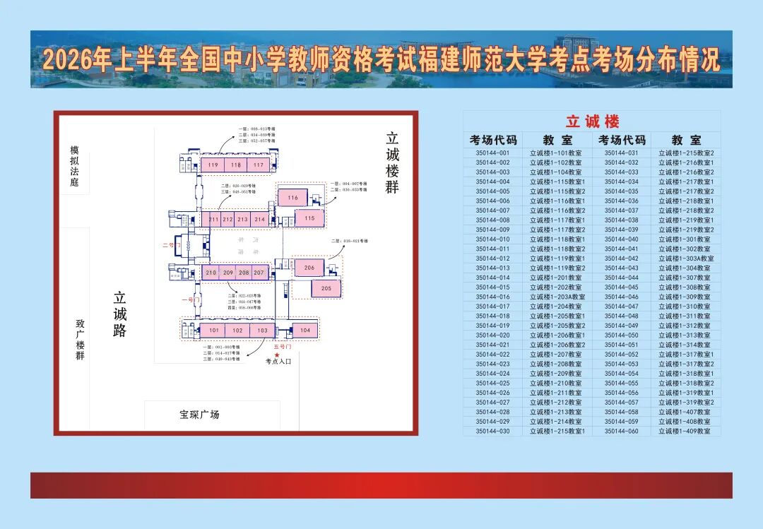 2026年上半年中小学教师资格考试(笔试)将于2026年3月7日举行。福建师范大学考点考场分布在旗山校区笃行楼、立诚楼。