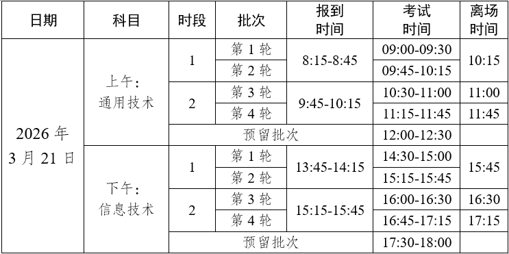 考生应按照准考证上的报到时间要求,在规定时间内进入候考室,务必核准所在批次考试时间,按时考试。未在规定时间完成报到的考生,不允许进入候考室、不得参加考试。