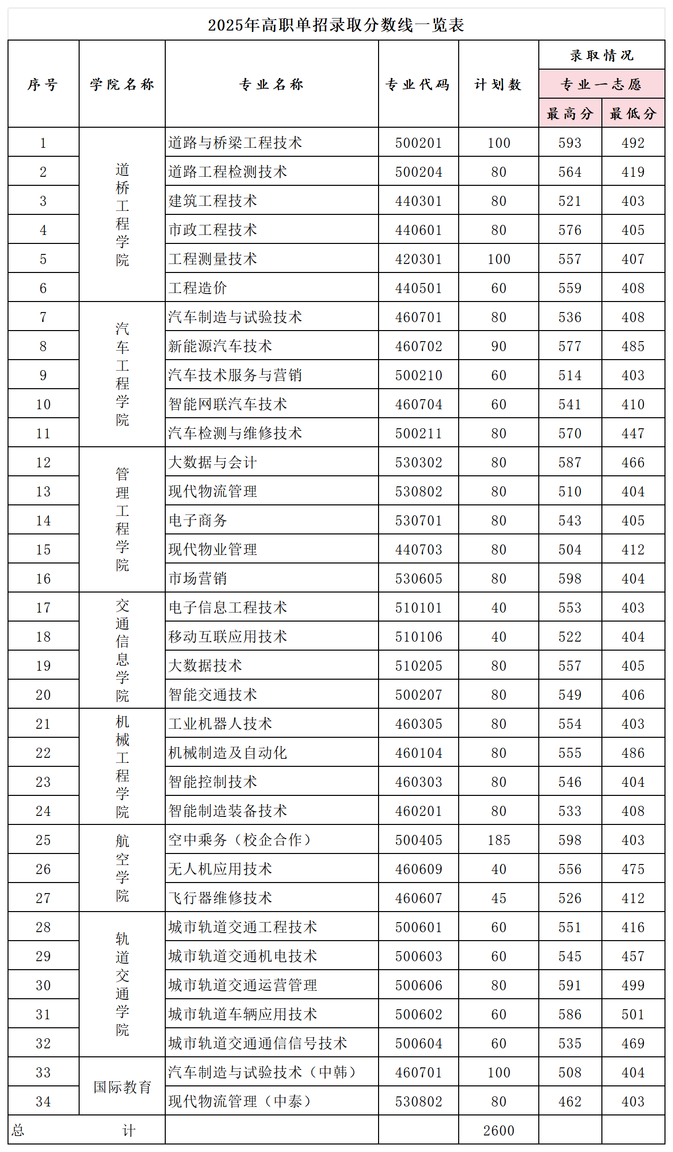 2025年高职单招录取分数线一览表