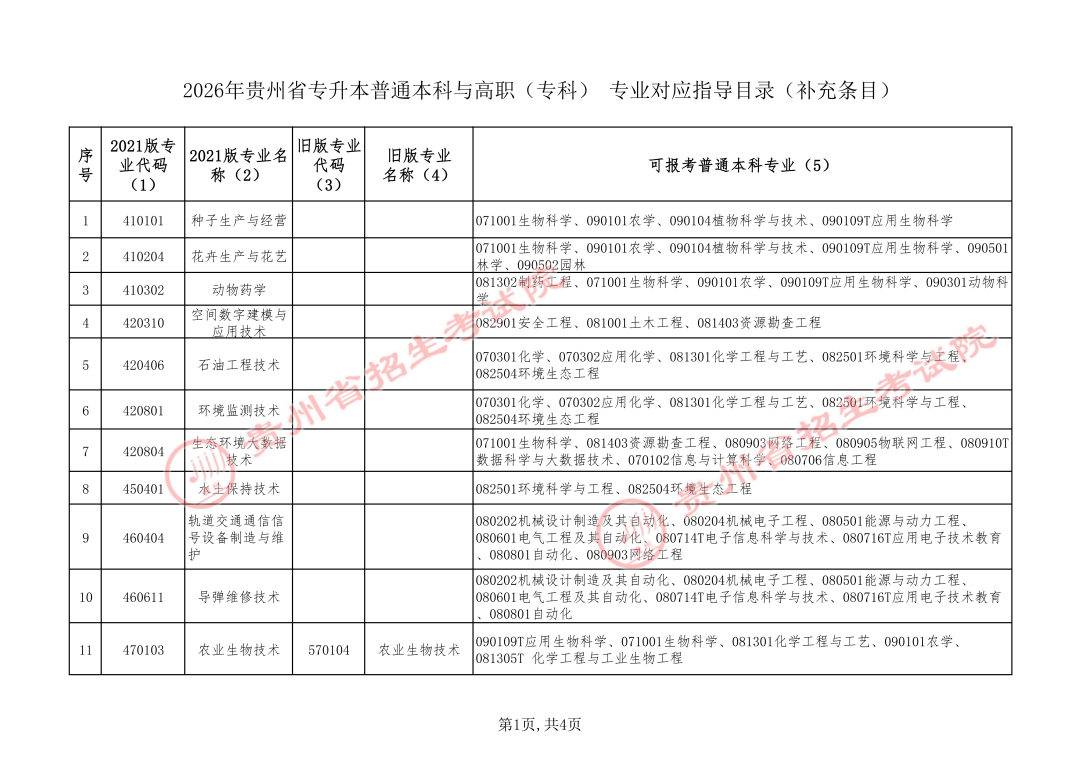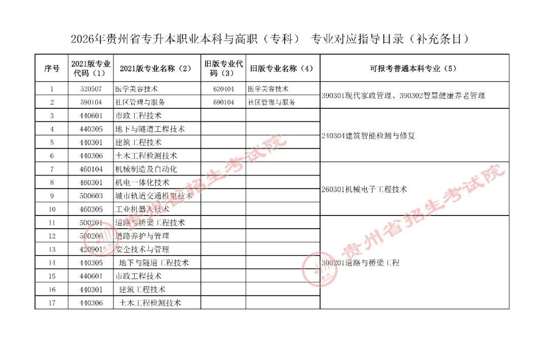 根据《教育部办公厅关于公布2026年本科层次职业教育专业设置备案结果的通知》(教职成厅函〔2026〕5号),贵州省交通职业大学2026年本科层次职业教育专业设置备案工作已完成,从2026年起开始进行专升本招生。结合我省2026年专升本考试招生报名情况,现将2026年贵州省专升本专业对应指导目录补充条目公布如下: