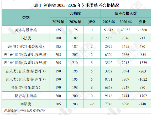 河南2026年各类别统考合格线呈现出不同的变化。舞蹈类合格线较上年下降,