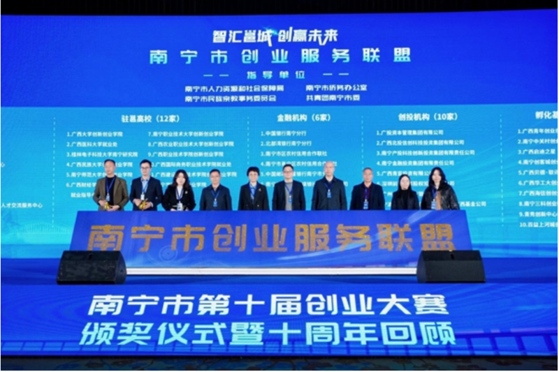 本次活动由南宁市人力资源和社会保障局、南宁市侨务办公室、共青团南宁市委员会联合主办,南宁市委常委、统战部部长、副市长韦江出席仪式并发言,自治区人力资源和社会保障厅党组成员、副厅长韦杰等相关领导参加活动。活动立足南宁市创业大赛十周年新起点,揭牌成立南宁市创业服务联盟,旨在整合政企校研各方资源,强化“赛事+孵化+产业”全链条创业服务体系,重点聚焦东盟跨境合作与重点产业升级两大方向,持续优化南宁创业生态、集聚创新资源、培育优质企业。