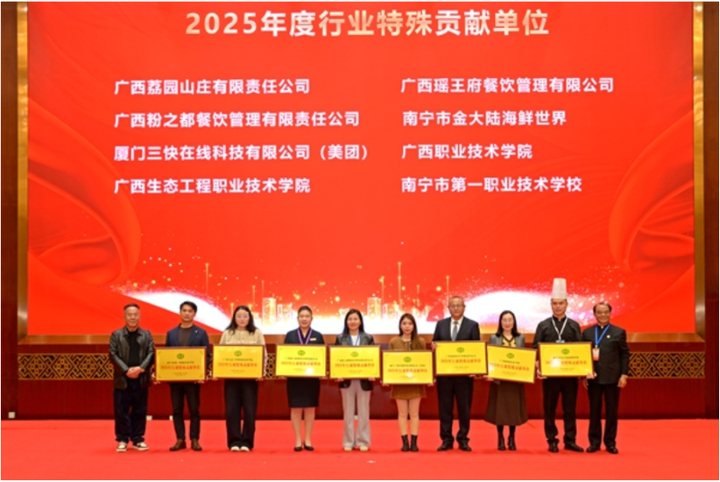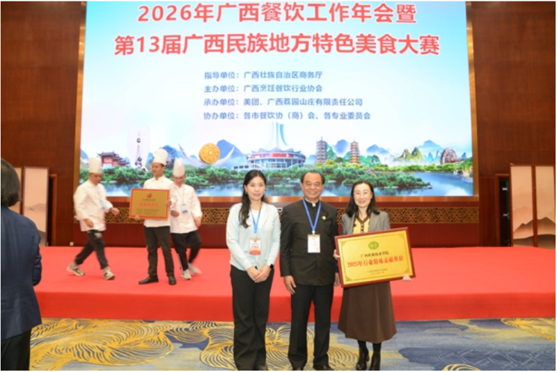 近日,2026年广西餐饮工作年会暨第13届广西民族地方特色美食大赛在南宁举行。学校凭借在餐饮行业标准化建设中的突出贡献,获评广西烹饪餐饮行业协会“2025年行业特殊贡献单位”。