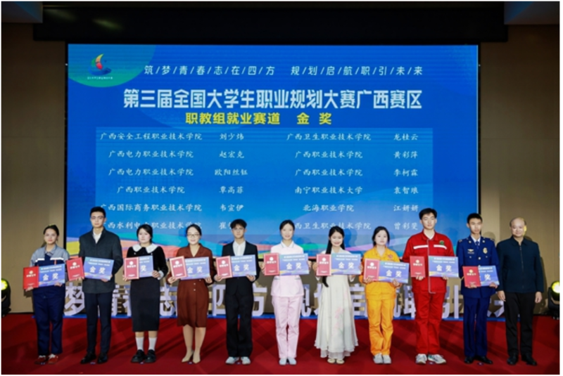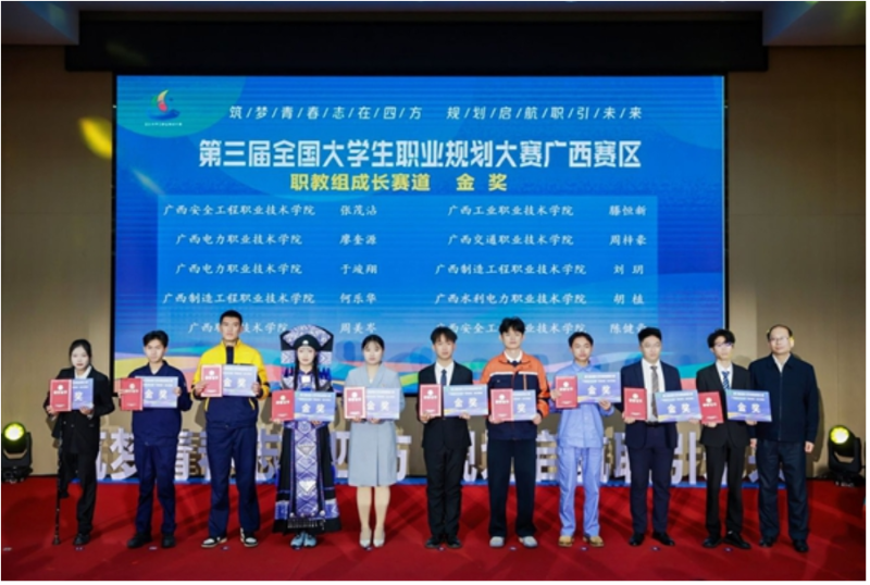 1月12日,第三届全国大学生职业规划大赛广西赛区总决赛颁奖典礼暨基层就业代表宣讲启动大会在南宁师范大学举行。我校学子勇夺就业赛道3项金奖,成长赛道1项金奖、1项银奖,创下参与该项赛事以来的历史最佳成绩。