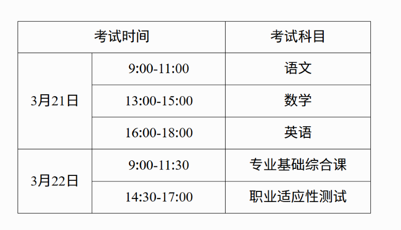 今年我区职教高考的时间为3月21日至22日,共两天。根据考试要求,考生于考前40分钟开始进入考场,开考15分钟后迟到考生不得进入考点和考场。考试结束前30分钟,经监考员允许,考生方可交卷出场。