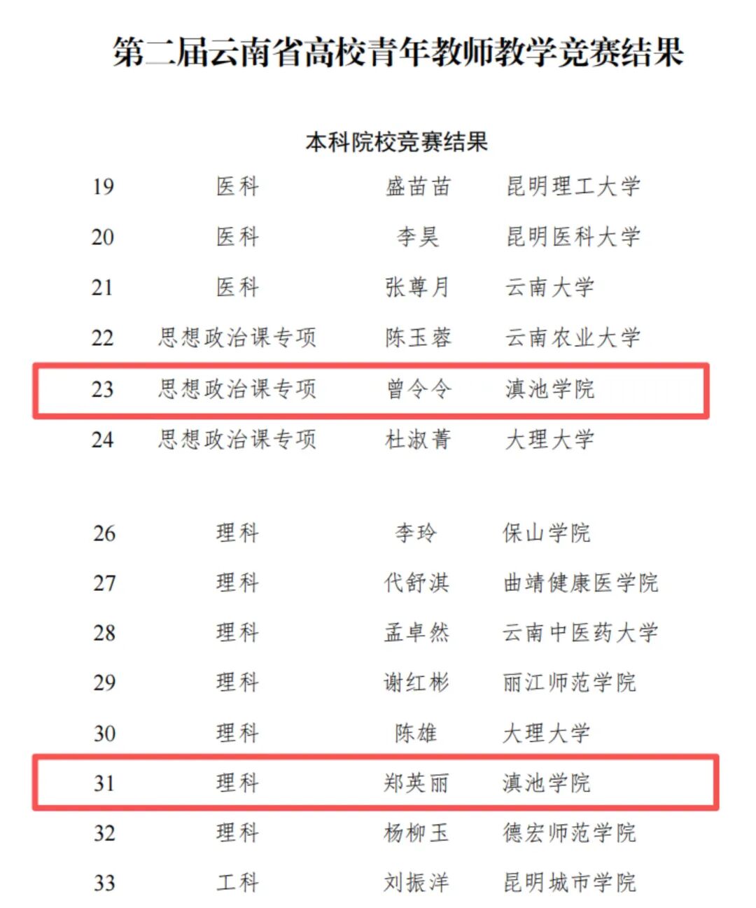 近日,云南省总工会与云南省教育厅联合发布《关于公布第二届云南省高校青年教师教学竞赛结果的通知》,滇池学院青年教师在本次竞赛中表现优异,斩获多项荣誉,充分彰显我校教师扎实的教学能力与良好的专业素养。马克思主义学院教师曾令令荣获思想政治课专项组一等奖,理工学院教师郑英丽荣获理科组三等奖,充分体现我校青年教师在教学一线深耕细作、勇于突破的卓越风采。