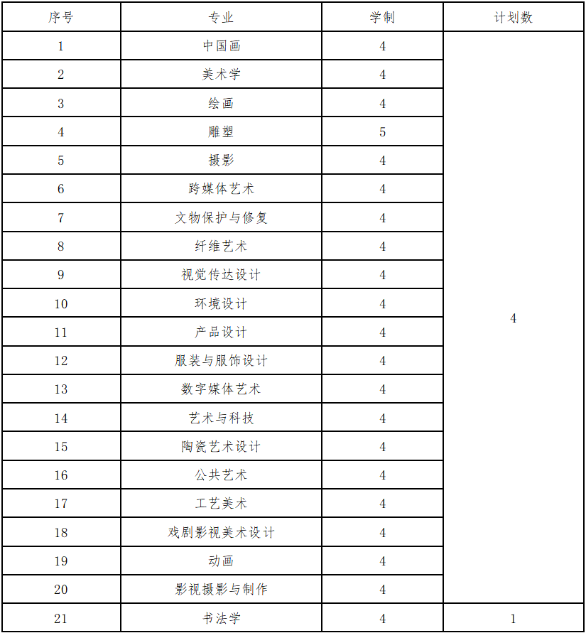 注:书法招生不超过1人,当书法学生源不足时可将计划调整至其他专业,最终计划以上级主管部门批复为准。