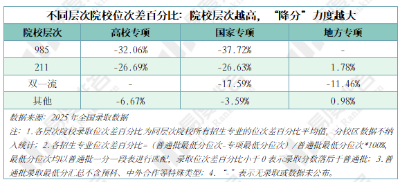 如下表所示,高校专项、国家专项的降分力度呈现显著的院校层次梯度差异:985院校的位次差百分比绝对值超30%,而其他层次院校该指标不足10%,反映了高水平院校拥有更大的政策自主权和资源调配能力,为吸引优秀学子,部分名校愿意拿出10-60分甚至“过一本线即录”的优惠力度。