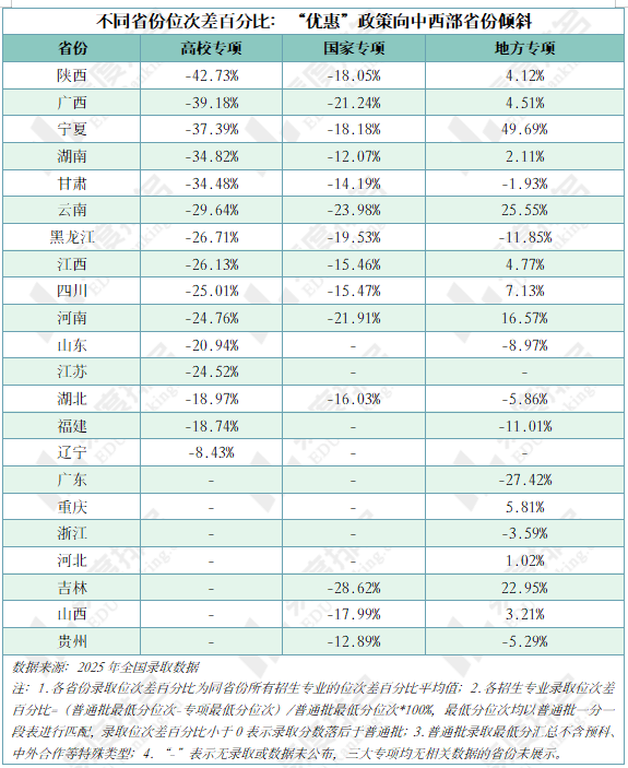 高校专项、国家专项的分数优惠呈现显著的区域倾斜性,中西部省份的政策力度普遍更大,这与两类专项计划以教育扶持促进区域教育公平的设立初衷高度契合。