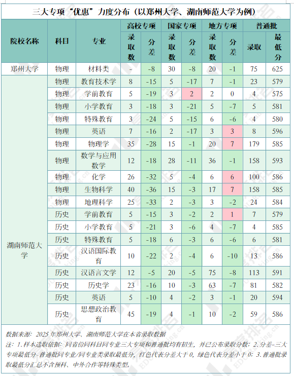 三大专项计划是国家为促进教育公平、助力特定群体升学而设立的高考专项招生政策,包含国家专项计划、地方专项计划和高校专项计划。相较于普通批次,其在同专业(或专业类)录取中具备显著的分数优势,即专项批次录取分数线普遍低于普通批次(下文简称“降分”)。