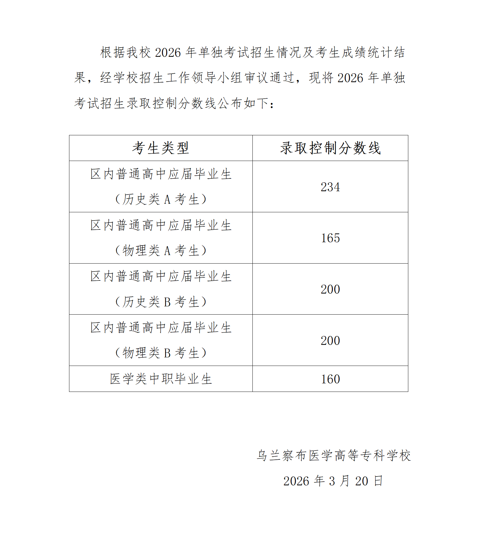 乌兰察布医学高等专科学校2026年单独考试招生录取控制分数线