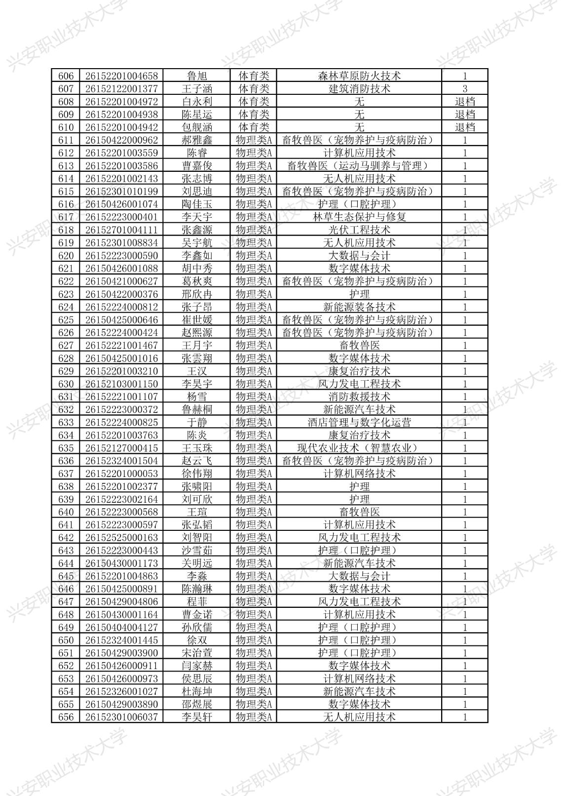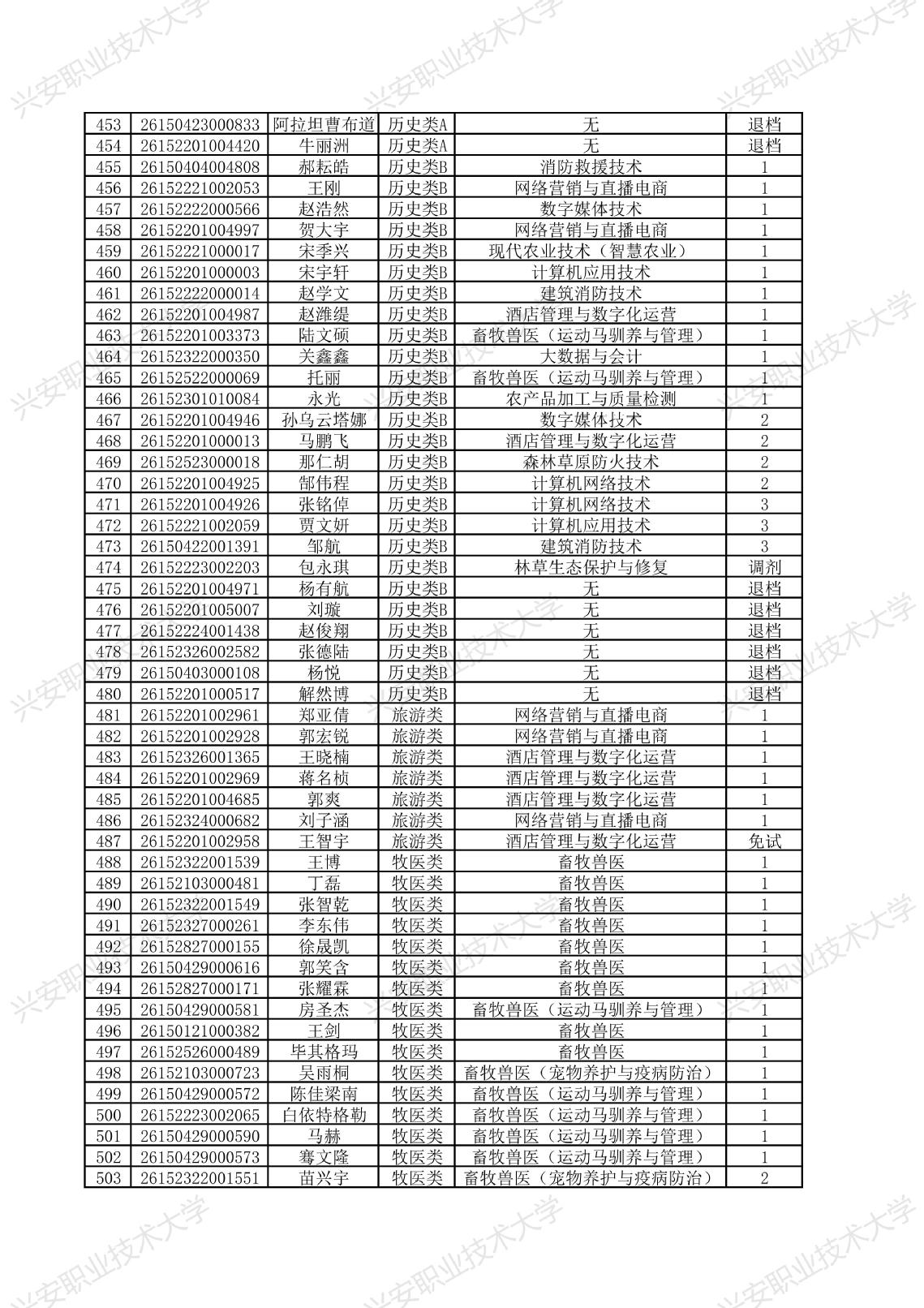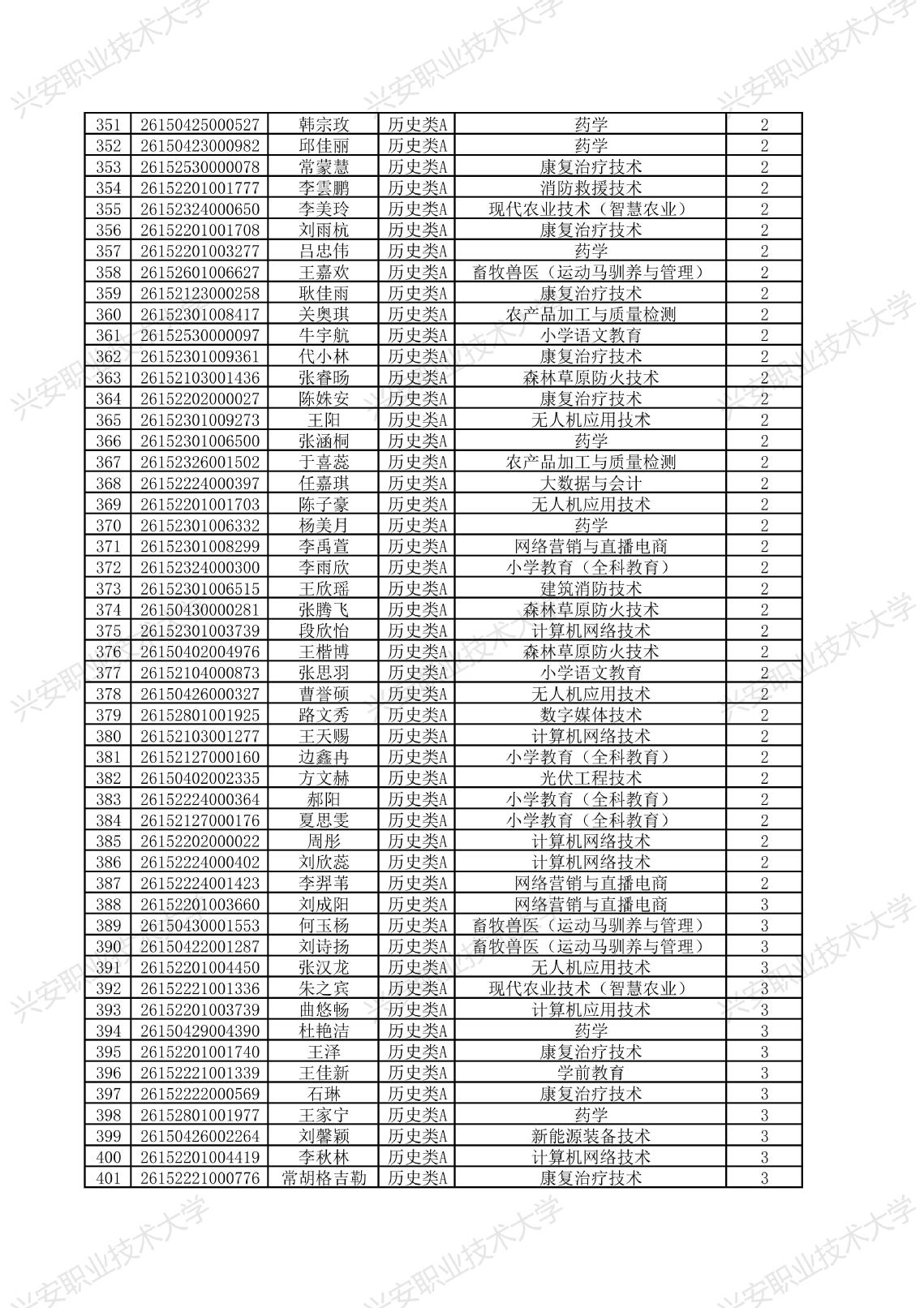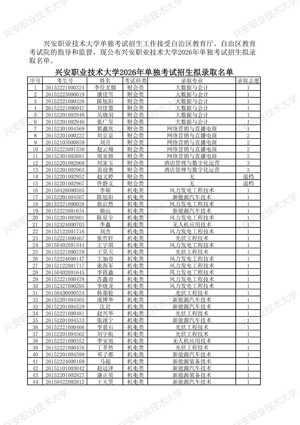 兴安职业技术大学2026年单独考试招生拟录取名单