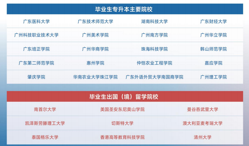 学校校内开设专升本辅导班,普通专升本(专插本)成功率连年80%+,每年超 1200 名学子考入广东医科大学、广东财经大学、广州华商学院等知名本科院校。