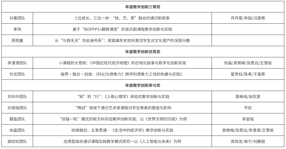 李潇潇团队《小课程的大思政:〈中国近现代经济地理〉的在地化叙事与数字化创新实践》与刘戈团队《破界・融合・创造:〈科幻与想象力〉跨学科想象力工场的构建与实践》荣获年度教学创新优秀奖。刘玲玲团队、孙瑶瑶团队、聂盈团队、徐晶团队、高姣姣团队荣获年度教学创新参与奖。