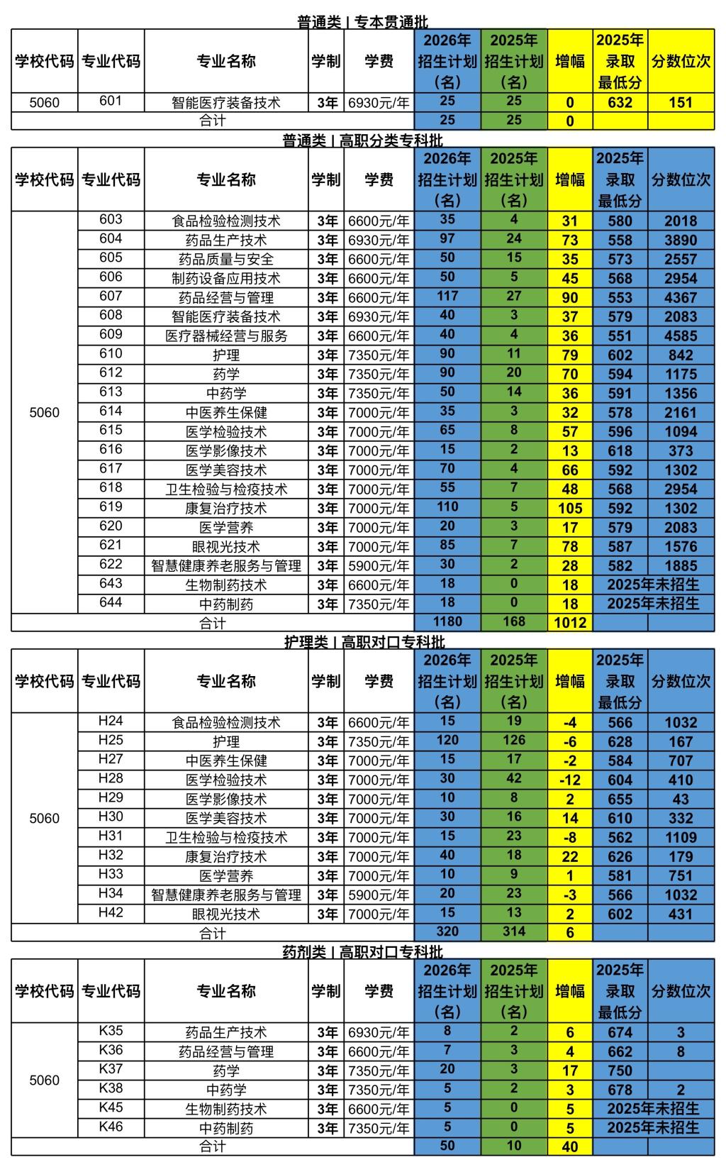 重庆医药高等专科学校2026年重庆市高职分类考试招生计划