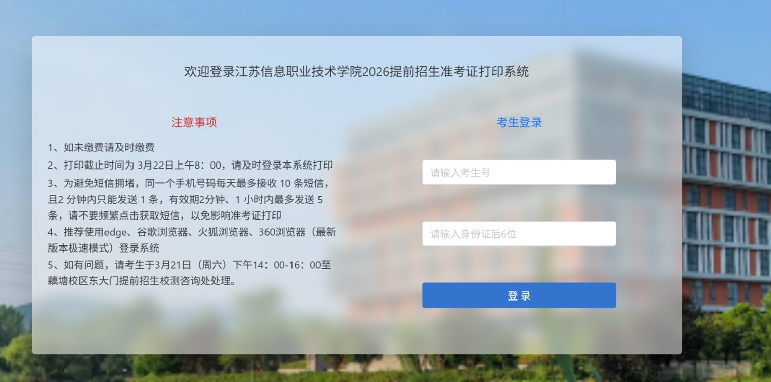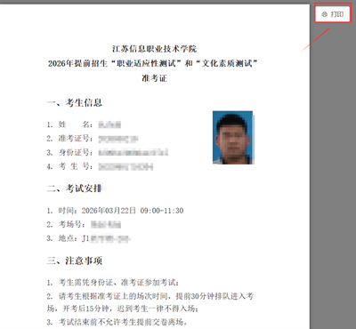 根据我校2026年提前招生考试工作安排,考生于3月19-21日在网上打印提前招生校测准考证,相关操作步骤说明如下: