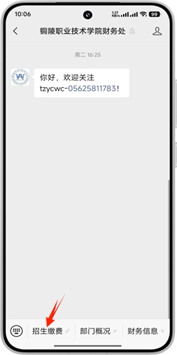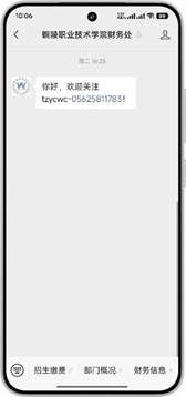 微信搜索“铜陵职业技术学院财务处”服务号并关注。或者直接扫码关注微信服务号。