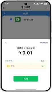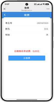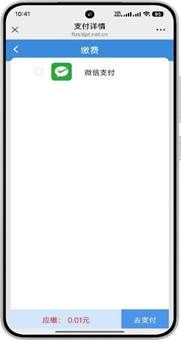 3、再次点击【缴费】跳转至缴费界面,点击【去缴费】后选择支付方式,点击【去支付】跳转至微信收银台界面,付款成功后会显示缴费状态。