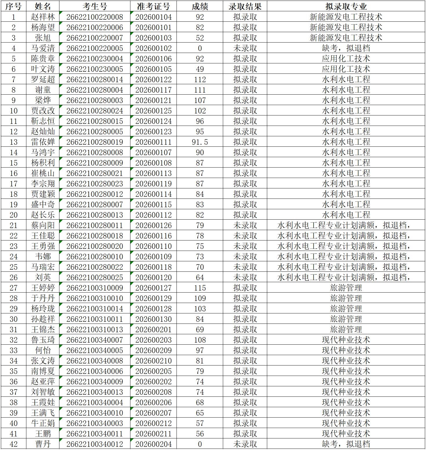 根据甘肃省高等学校招生委员会《关于印发2026年甘肃省普通高校高职(专科)升本科免试生招生工作实施方案的通知》(甘招委发〔2026〕1号)要求,我校2026年普通高校高职(专科)升本科第二轮免试招生专业能力测试已顺利结束。为体现公开、公平、公正原则,主动接受监督,现将拟录取结果公示如下。